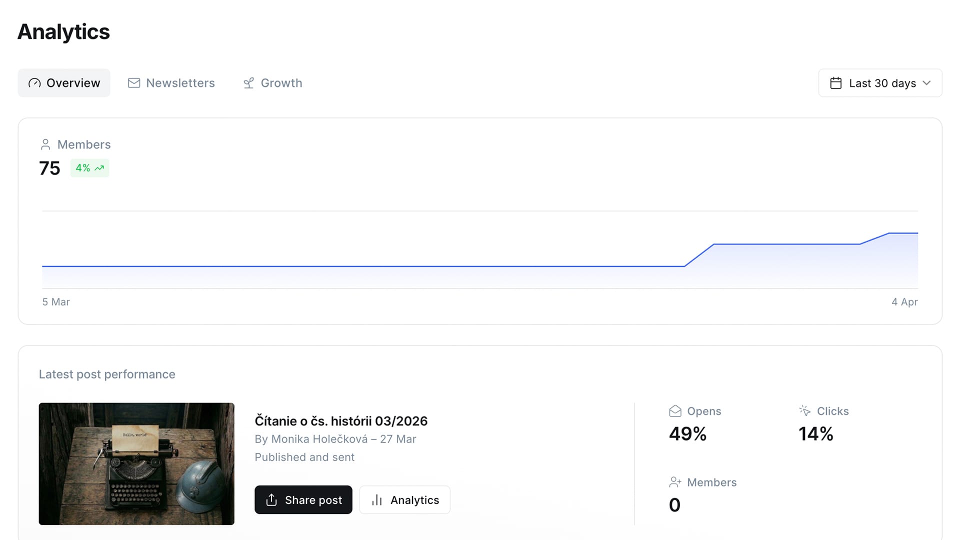 Pandorina skrinka má aktuálne 75 odberateľov so zameraním na históriu Československa, z nich 49 % si pravidelne otvori newsletter.